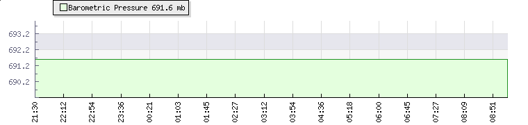 | Wind Speed: | 1|2|2 knots | Wind Direction: | W 270° | Temperature: | 22.6°C | | Wet Bulb: | 20.2°C | Discomfort: | 88 | Humidity: | 81% | | Rainfall Today: | 0mm | 12 hrs Rainfall: | 0mm | 24 hrs Rainfall: | 0mm | | Barometer: | 691.6mb | Dew Point: | 19.2°C | Clouds AGL: | 1373ft (418 m) | | Density-Alt: | 13681ft (4170 m) | Fire Danger: | |