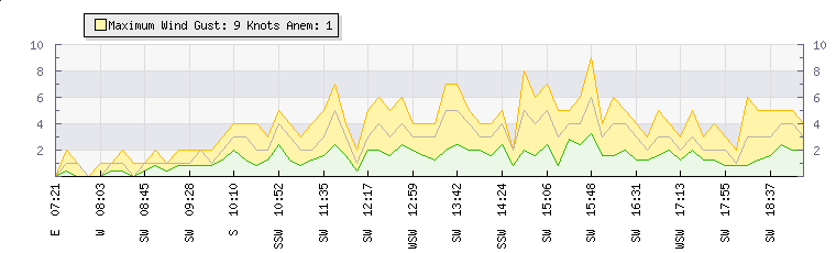 In the last few minutes the wind was North North East at an average speed of 2 knots, reaching up to 2 knots and a low of 1 knots. The gust strength is1 knots above the minimum speed |