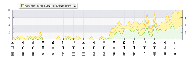 In the last few minutes the wind was South South East at an average speed of 0 knots, reaching up to 0 knots and a low of 0 knots. The gust strength is0 knots above the minimum speed |