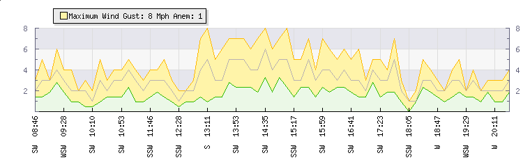 In the last few minutes the wind was South South West at an average speed of 5 mph, reaching up to 7 mph and a low of 2 mph. The gust strength is5 mph above the minimum speed |