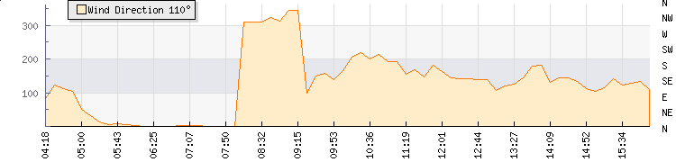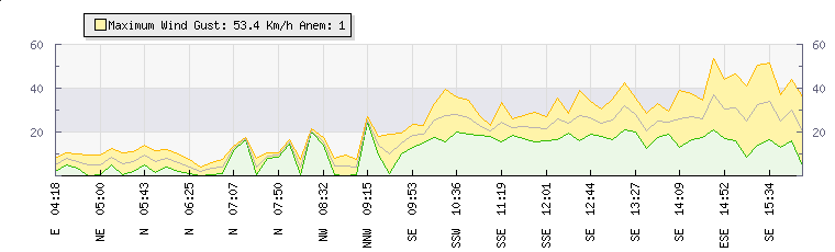 In the last few minutes the wind was Southerly at an average speed of 24 kmh, reaching up to 30 kmh and a low of 19 kmh. The gust strength is11 kmh above the minimum speed |