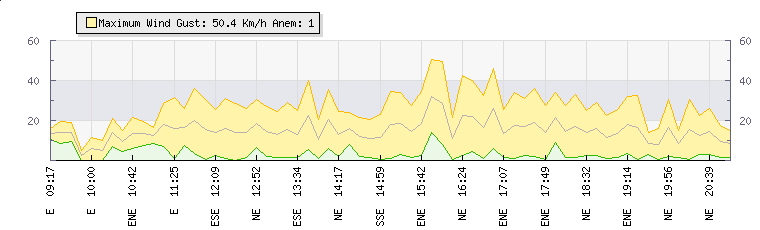 Weather Summary: In the last few minutes the wind was East North East at an average speed of 14 kmh, reaching up to 27 kmh and a low of 1 kmh. The gust strength is26 kmh above the minimum speed