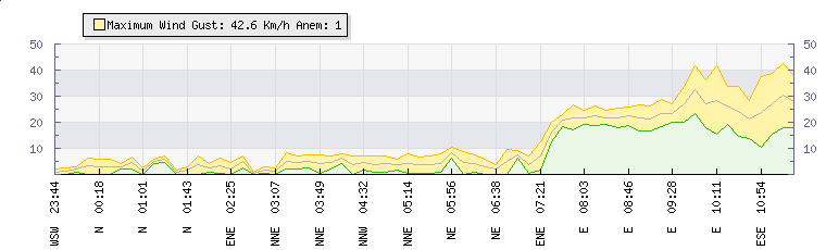 In the last few minutes the wind was Easterly at an average speed of 27 kmh, reaching up to 34 kmh and a low of 20 kmh. The gust strength is14 kmh above the minimum speed |