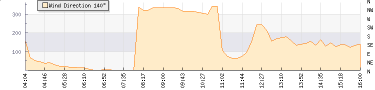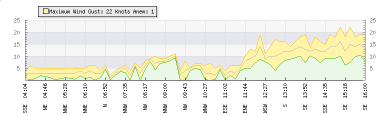 In the last few minutes the wind was South South East at an average speed of 13 knots, reaching up to 18 knots and a low of 9 knots. The gust strength is9 knots above the minimum speed |
