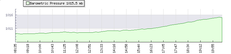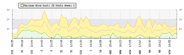 In the last few minutes the wind was North North East at an average speed of 8 knots, reaching up to 14 knots and a low of 1 knots. The gust strength is13 knots above the minimum speed |