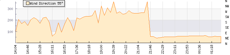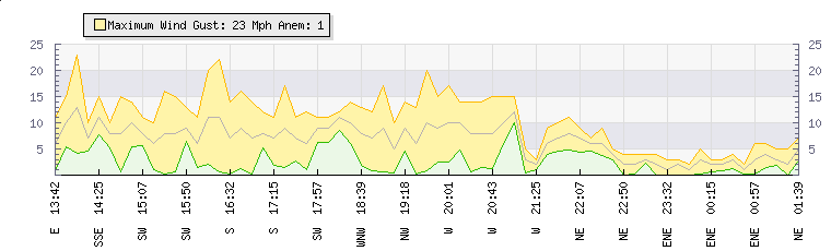 In the last few minutes the wind was North Easterly at an average speed of 3 mph, reaching up to 4 mph and a low of 2 mph. The gust strength is2 mph above the minimum speed |