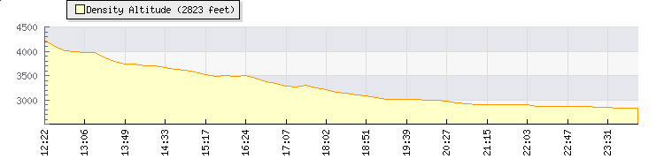 | Wind Speed: | -|-|- kmh | Wind Direction: | WSW 256° | Temperature: | 38.4°C | | Wet Bulb: | 24.9°C | Discomfort: | 113 | Humidity: | 31% | | Rainfall Today: | 0mm | 12 hrs Rainfall: | 0mm | 24 hrs Rainfall: | 0mm | | Barometer: | 1016.3mb | Dew Point: | 18.2°C | Clouds AGL: | 8061ft (2457 m) | | Density-Alt: | 5272ft (1607 m) | Solar Radiation: | 605Wm² |