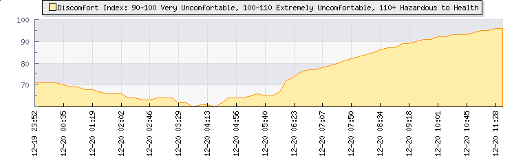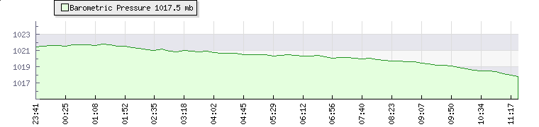 | Wind Speed: | -|-|- kmh | Wind Direction: | WNW 299° | Temperature: | 28.9°C | | Wet Bulb: | 17.7°C | Discomfort: | 91 | Humidity: | 31% | | Rainfall Today: | 0mm | 12 hrs Rainfall: | 0mm | 24 hrs Rainfall: | 0mm | | Barometer: | 1018.8mb | Dew Point: | 10°C | Clouds AGL: | 7535ft (2297 m) | | Density-Alt: | 4049ft (1234 m) | Solar Radiation: | 748Wm² |