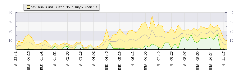 | Wind Gust: | - | Min Temp: | 12.8 °C | Max Temp: | 28.9 °C | | Wind Average: | - | Min Hum: | 31 % | Max Hum: | 82 % | |  |