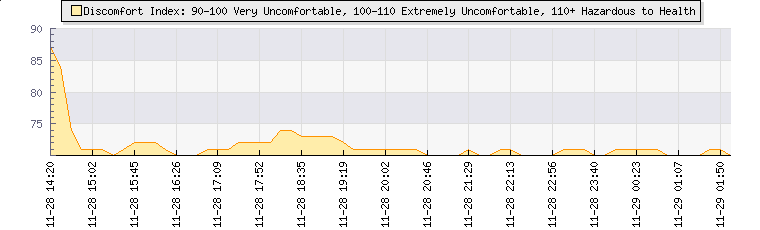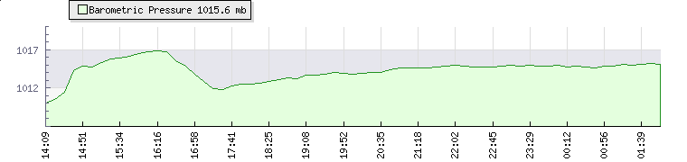 | Wind Speed: | -|-|- mph | Wind Direction: | WSW 238° | Temperature: | 15.6°C | | Wet Bulb: | 15.6°C | Discomfort: | 71 | Humidity: | 100% | | Rainfall Today: | 0mm | 12 hrs Rainfall: | 11.4mm | 24 hrs Rainfall: | 11.4mm | | Barometer: | 1015.3mb | Dew Point: | 15.6°C | Density-Alt: | 2743ft (836 m) |
