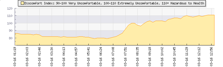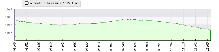 | Wind Speed: | -|-|- mph | Wind Direction: | ESE 114° | Temperature: | 36.8°C | | Wet Bulb: | 23.5°C | Discomfort: | 109 | Humidity: | 30% | | Rainfall Today: | 0mm | 12 hrs Rainfall: | 0mm | 24 hrs Rainfall: | 0.5mm | | Barometer: | 1016.4mb | Dew Point: | 16.4°C | Clouds AGL: | 8183ft (2494 m) | | Density-Alt: | 5079ft (1548 m) | Solar Radiation: | 690Wm² |
