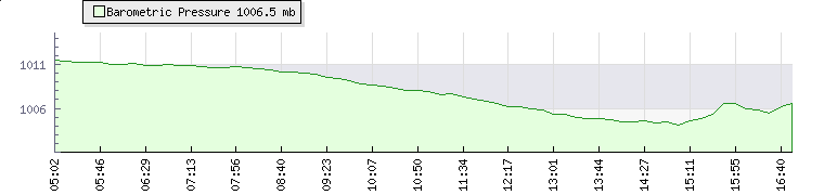 | Wind Speed: | -|-|- mph | Wind Direction: | WSW 254° | Temperature: | 33°C | | Wet Bulb: | 21.1°C | Discomfort: | 101 | Humidity: | 32% | | Rainfall Today: | 0mm | 12 hrs Rainfall: | 0mm | 24 hrs Rainfall: | 0mm | | Barometer: | 1009.9mb | Dew Point: | 14.1°C | Clouds AGL: | 7569ft (2307 m) | | Density-Alt: | 4852ft (1479 m) | Solar Radiation: | 707Wm² |