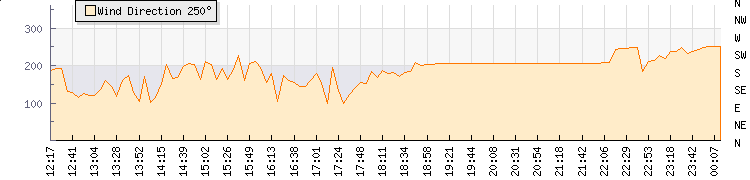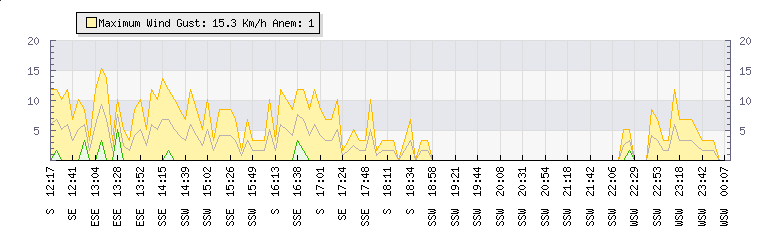 In the last few minutes the wind was West South West at an average speed of 2 kmh, reaching up to 3 kmh and a low of 0 kmh. The gust strength is3 kmh above the minimum speed |