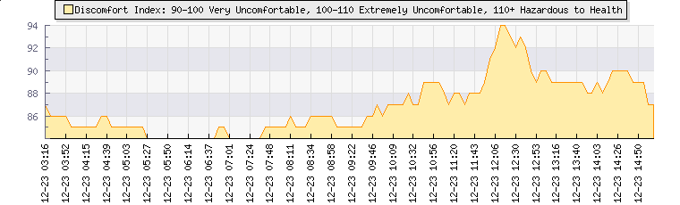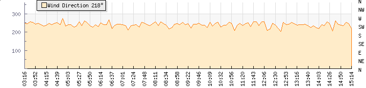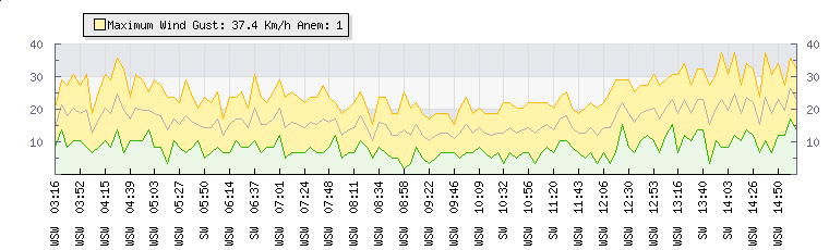 In the last few minutes the wind was West South West at an average speed of 23 kmh, reaching up to 34 kmh and a low of 12 kmh. The gust strength is22 kmh above the minimum speed |