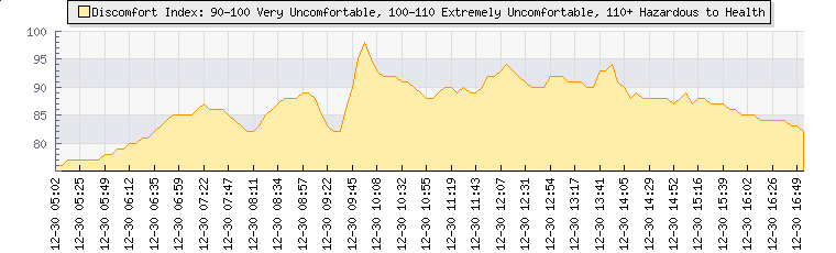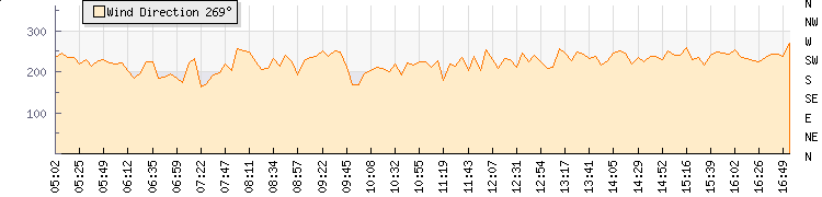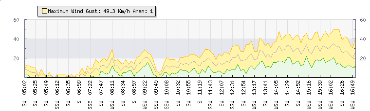 In the last few minutes the wind was South Westerly at an average speed of 31 kmh, reaching up to 44 kmh and a low of 17 kmh. The gust strength is27 kmh above the minimum speed |