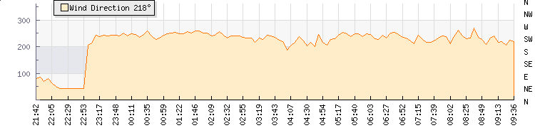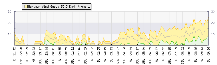 In the last few minutes the wind was West South West at an average speed of 5 kmh, reaching up to 9 kmh and a low of 2 kmh. The gust strength is7 kmh above the minimum speed |
