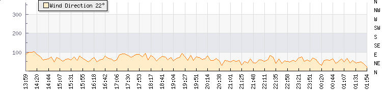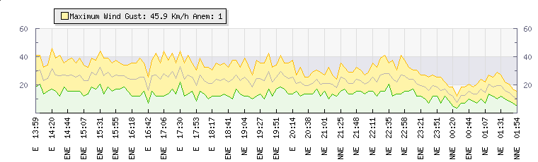 In the last few minutes the wind was North Easterly at an average speed of 18 kmh, reaching up to 24 kmh and a low of 12 kmh. The gust strength is12 kmh above the minimum speed |