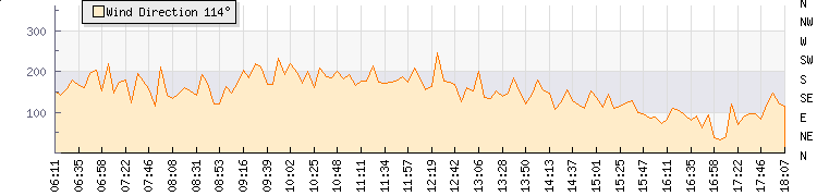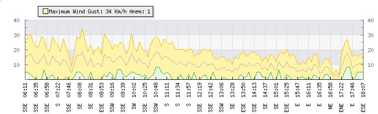 In the last few minutes the wind was East North East at an average speed of 5 kmh, reaching up to 10 kmh and a low of 0 kmh. The gust strength is10 kmh above the minimum speed |