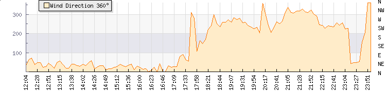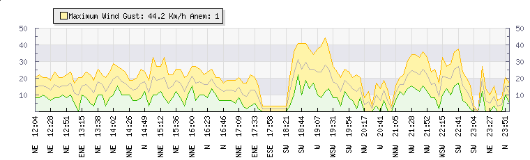 In the last few minutes the wind was West South West at an average speed of 20 kmh, reaching up to 29 kmh and a low of 10 kmh. The gust strength is19 kmh above the minimum speed |