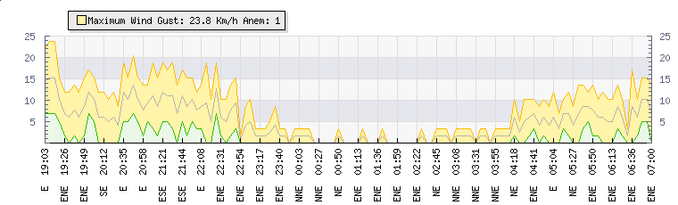 In the last few minutes the wind was North Easterly at an average speed of 6 kmh, reaching up to 10 kmh and a low of 2 kmh. The gust strength is8 kmh above the minimum speed |