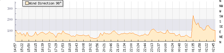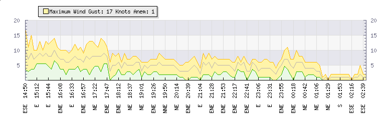 In the last few minutes the wind was East North East at an average speed of 5 knots, reaching up to 9 knots and a low of 1 knots. The gust strength is8 knots above the minimum speed |