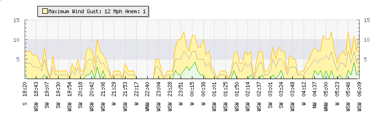 In the last few minutes the wind was Westerly at an average speed of 1 mph, reaching up to 2 mph and a low of 0 mph. The gust strength is2 mph above the minimum speed |