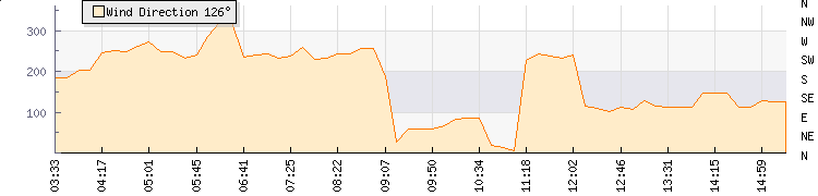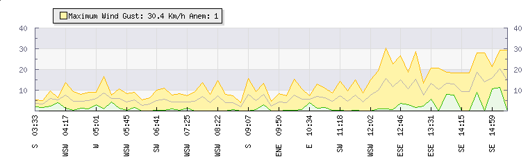 In the last few minutes the wind was East South East at an average speed of 13 kmh, reaching up to 19 kmh and a low of 8 kmh. The gust strength is11 kmh above the minimum speed |