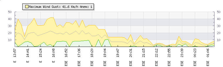 In the last few minutes the wind was East South East at an average speed of 6 kmh, reaching up to 11 kmh and a low of 1 kmh. The gust strength is10 kmh above the minimum speed |