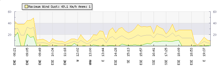In the last few minutes the wind was East South East at an average speed of 10 kmh, reaching up to 20 kmh and a low of 0 kmh. The gust strength is20 kmh above the minimum speed |