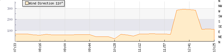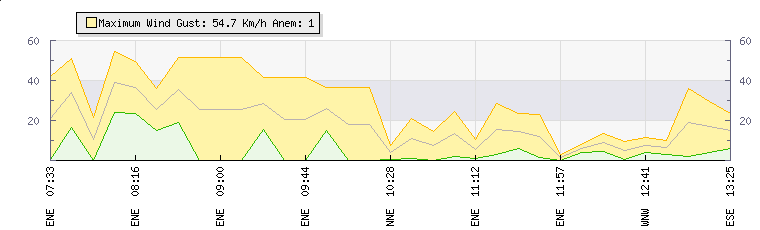 In the last few minutes the wind was East North East at an average speed of 12 kmh, reaching up to 23 kmh and a low of 1 kmh. The gust strength is22 kmh above the minimum speed |