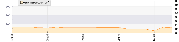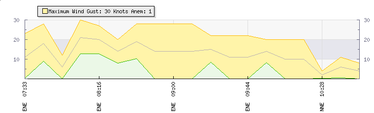 In the last few minutes the wind was East North East at an average speed of 14 knots, reaching up to 28 knots and a low of 0 knots. The gust strength is28 knots above the minimum speed |