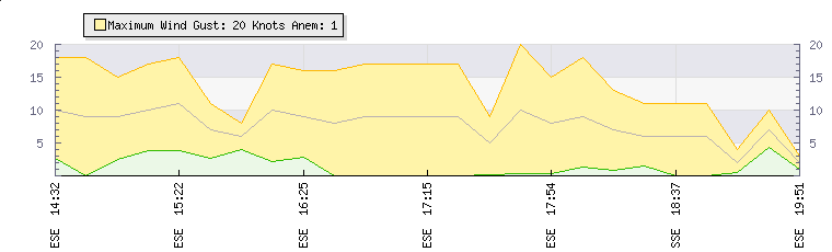 In the last few minutes the wind was East South East at an average speed of 2 knots, reaching up to 3 knots and a low of 1 knots. The gust strength is2 knots above the minimum speed |