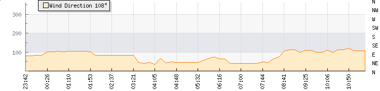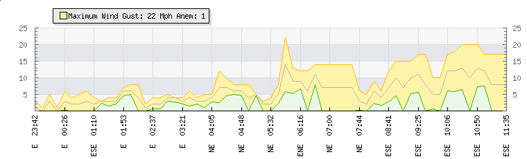 In the last few minutes the wind was Easterly at an average speed of 5 mph, reaching up to 10 mph and a low of 1 mph. The gust strength is9 mph above the minimum speed |