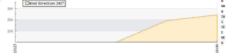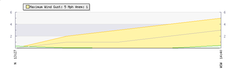 In the last few minutes the wind was West South West at an average speed of 3 mph, reaching up to 5 mph and a low of 0 mph. The gust strength is5 mph above the minimum speed |