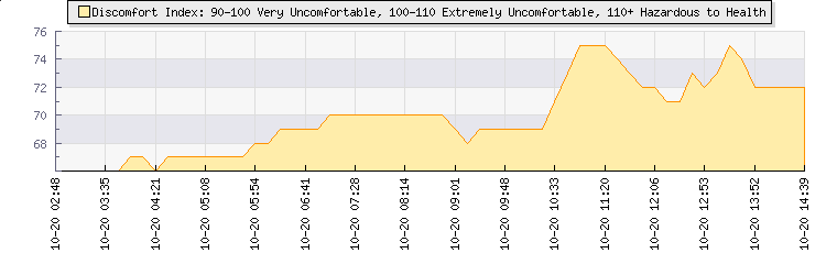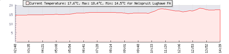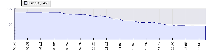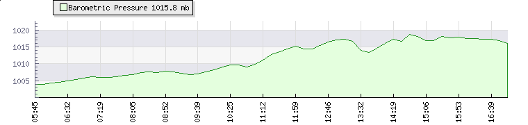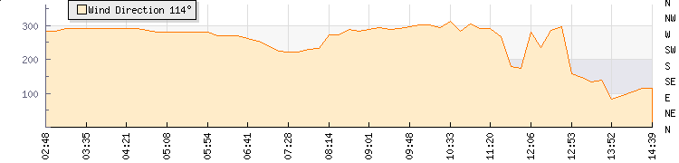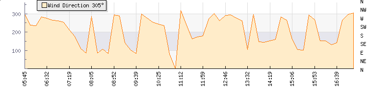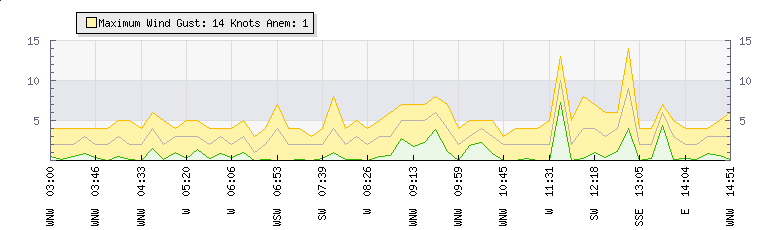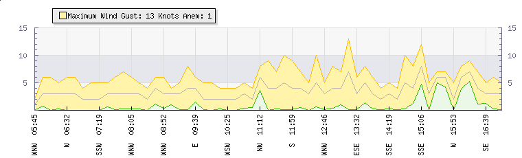 Wind Gust: | 9 knots | Min Temp: | 13.5 °C | Max Temp: | 16.5 °C | Wind Average: | 6 knots | Min Hum: | 86 % | Max Hum: | 89 % | |  |