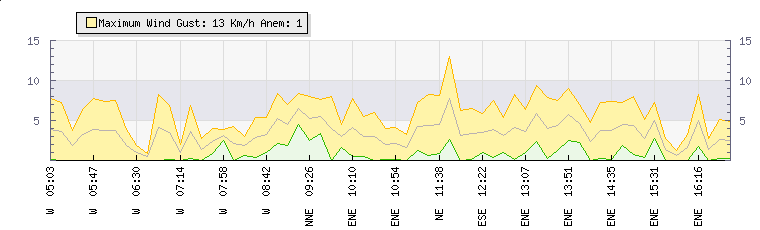 In the last few minutes the wind was East North East at an average speed of 5 kmh, reaching up to 7 kmh and a low of 3 kmh. The gust strength is4 kmh above the minimum speed |