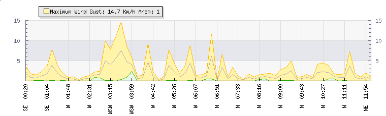 In the last few minutes the wind was Northerly at an average speed of 2 kmh, reaching up to 4 kmh and a low of 1 kmh. The gust strength is3 kmh above the minimum speed |