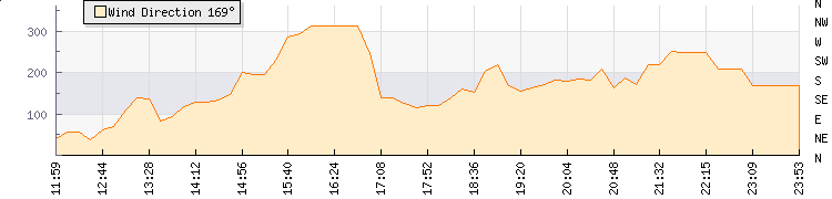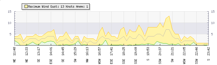 In the last few minutes the wind was Southerly at an average speed of 7 knots, reaching up to 13 knots and a low of 0 knots. The gust strength is13 knots above the minimum speed |