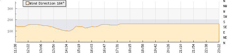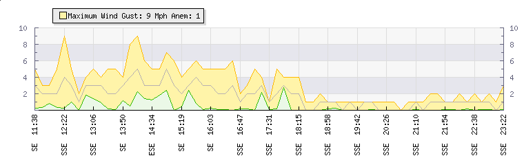 In the last few minutes the wind was South South East at an average speed of 1 mph, reaching up to 1 mph and a low of 0 mph. The gust strength is1 mph above the minimum speed |