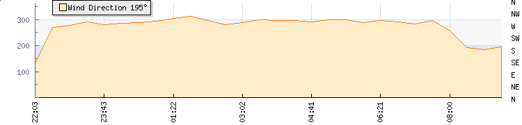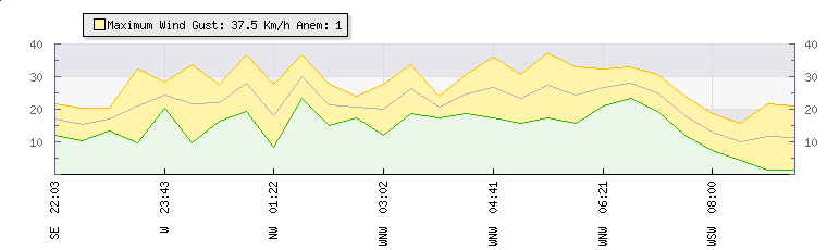In the last few minutes the wind was West North West at an average speed of 22 kmh, reaching up to 28 kmh and a low of 17 kmh. The gust strength is11 kmh above the minimum speed |