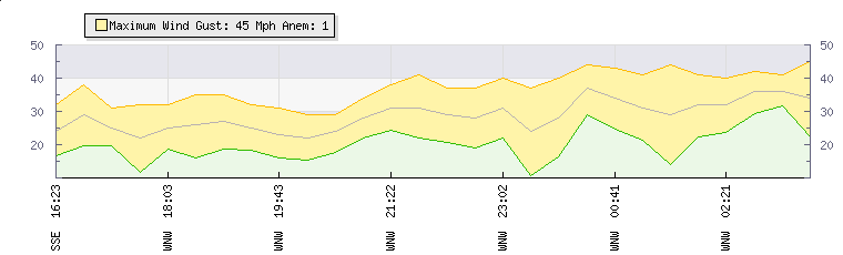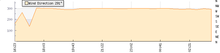 In the last few minutes the wind was West North West at an average speed of 24 mph, reaching up to 29 mph and a low of 18 mph. The gust strength is11 mph above the minimum speed |