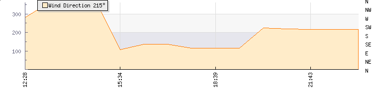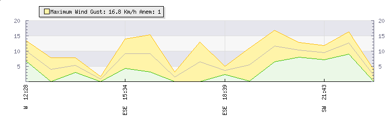 In the last few minutes the wind was South Westerly at an average speed of 10 kmh, reaching up to 12 kmh and a low of 7 kmh. The gust strength is5 kmh above the minimum speed |