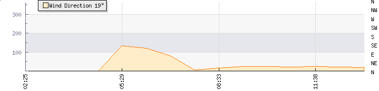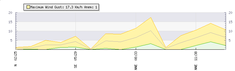 In the last few minutes the wind was North North East at an average speed of 6 kmh, reaching up to 11 kmh and a low of 2 kmh. The gust strength is9 kmh above the minimum speed |