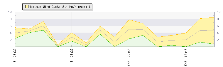 In the last few minutes the wind was Southerly at an average speed of 4 kmh, reaching up to 7 kmh and a low of 0 kmh. The gust strength is7 kmh above the minimum speed |