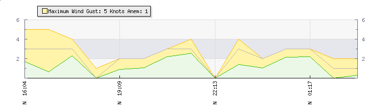 In the last few minutes the wind was Northerly at an average speed of 1 knots, reaching up to 2 knots and a low of 0 knots. The gust strength is2 knots above the minimum speed |