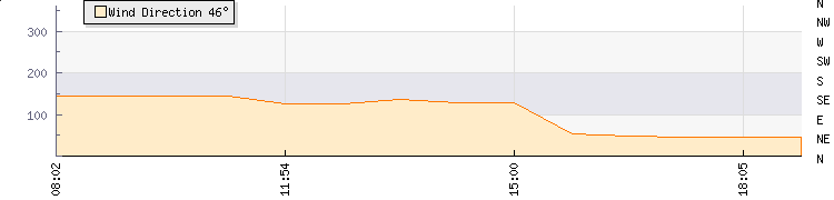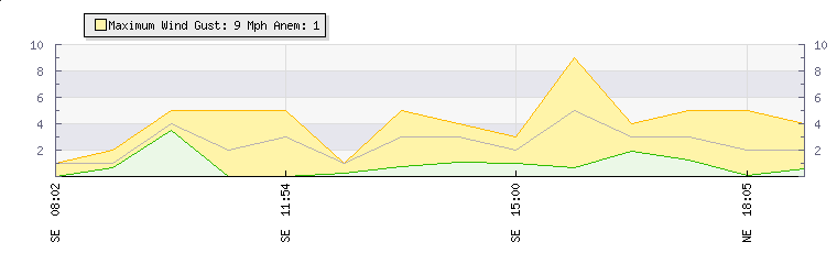 In the last few minutes the wind was North Easterly at an average speed of 2 mph, reaching up to 5 mph and a low of 0 mph. The gust strength is5 mph above the minimum speed |