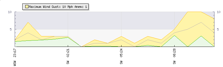 In the last few minutes the wind was South Westerly at an average speed of 1 mph, reaching up to 2 mph and a low of 0 mph.  The gust strength is2 mph above the minimum speed             |