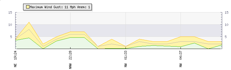 In the last few minutes the wind was Northerly at an average speed of 3 mph, reaching up to 4 mph and a low of 2 mph. The gust strength is2 mph above the minimum speed |