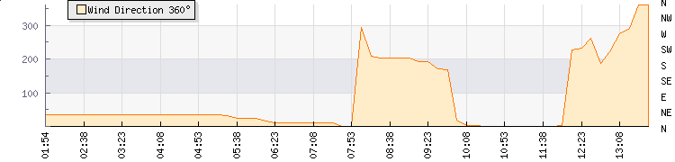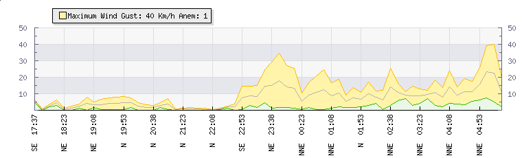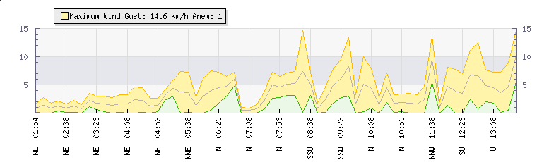 In the last few minutes the wind was North North East at an average speed of 11 kmh, reaching up to 14 kmh and a low of 7 kmh. The gust strength is7 kmh above the minimum speed |