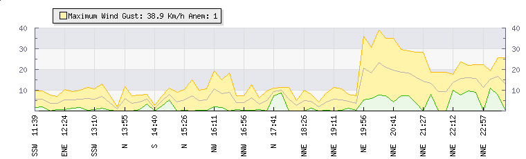 In the last few minutes the wind was North North East at an average speed of 9 kmh, reaching up to 19 kmh and a low of 0 kmh. The gust strength is19 kmh above the minimum speed |